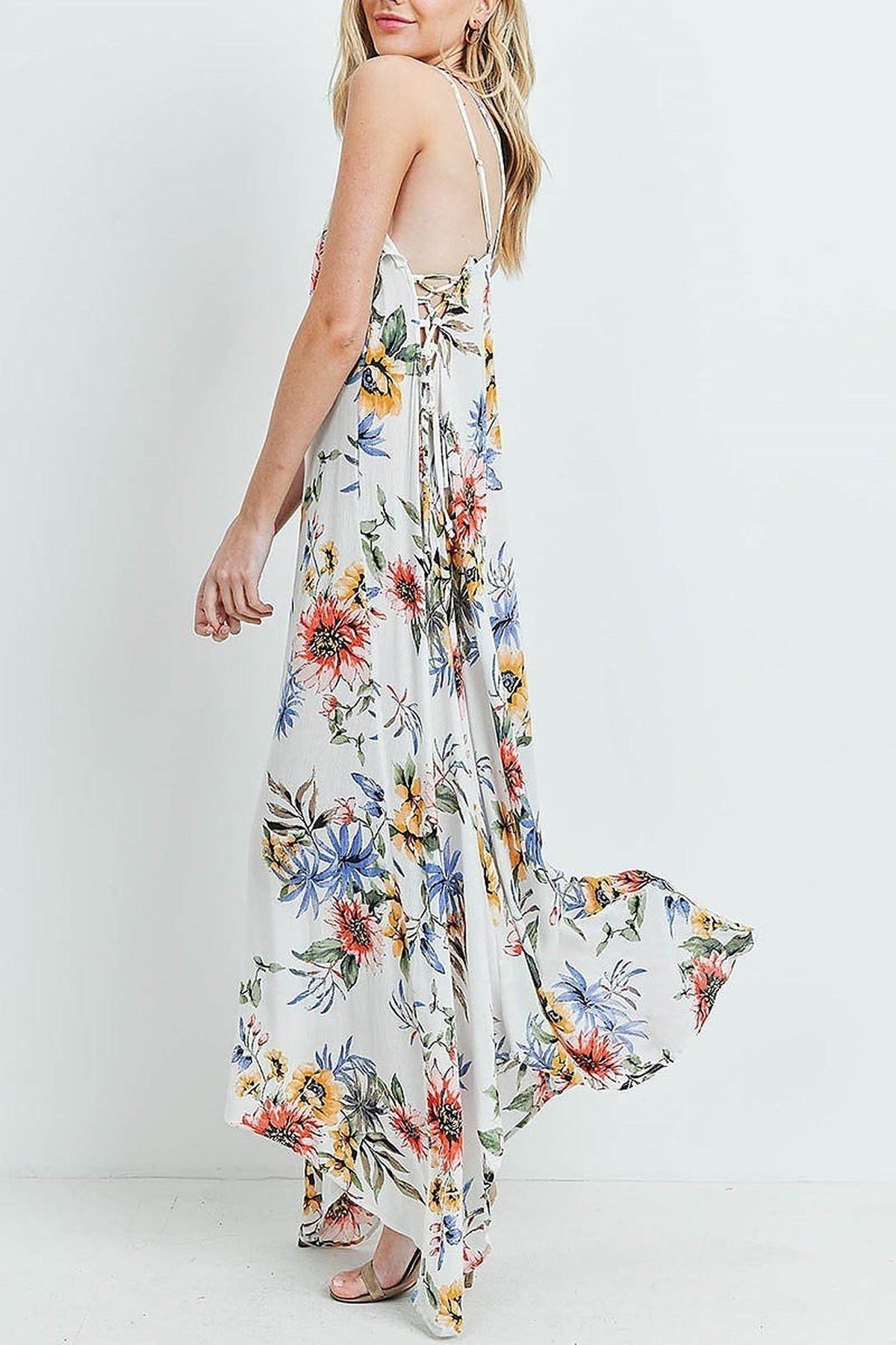 Gorgeous with a soft aesthetic, our Floral Flounce Asymmetrical Hem Maxi Dress with Crisscross Back is the perfect fashion piece for special occasions or everyday spring or summer outfits. The long dress features feminine ruffled details and a lovely flower print as well as a trendy uneven hem that you can use to your advantage to showcase your most fabulous heels.