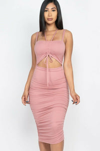 Ruched Drawstring Front Cut Out Double Strap Bodycon Midi Dress