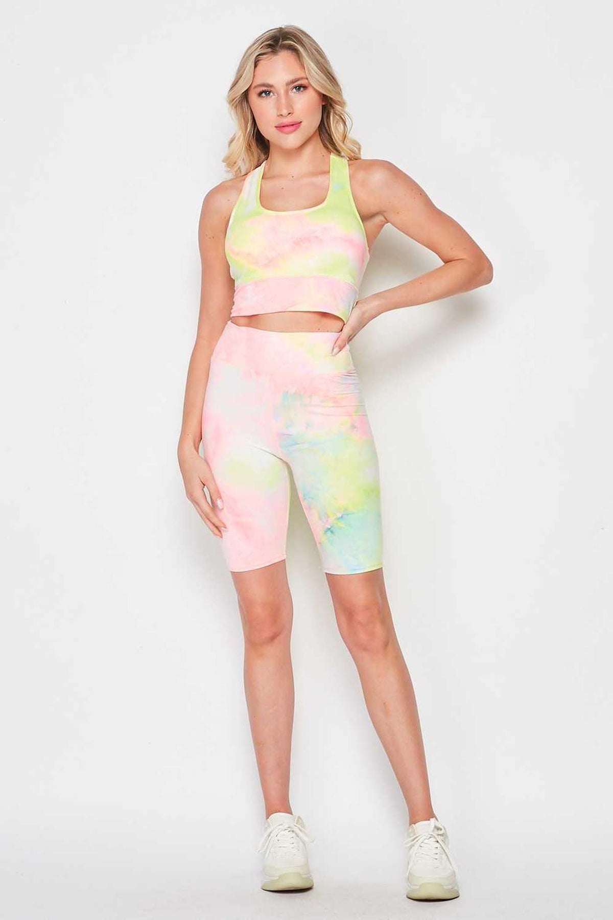 This trendy duo is our Tie Dye 2 Piece High Waisted Biker Shorts and Crop Top Set. Combining the super in vogue biker short and tie dye trends to bring you the perfect pre-styled outfit for casual day wear or light workouts, you're going to get so much use out of this comfortable and cute shorts and crop top set. Wear this two piece fashion set on a bicycle ride, for a hike, or pair it with a light wash denim jacket for a day out.