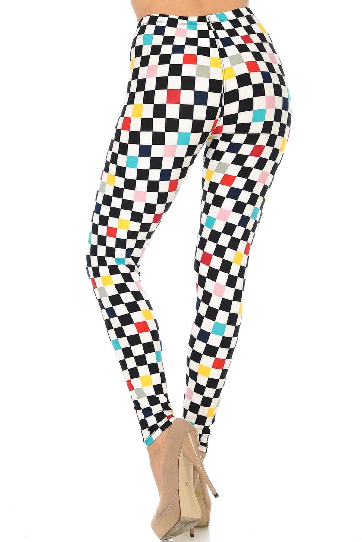 Add a pop of pizazz to your outfit with our Buttery Smooth Color Accent Checkered Extra Plus Size Leggings. This retro style leg fashion piece features an all over black and white checkerboard print with colorful square additions. Pair it with a fitted red tee or sweater and get a cute look for any season.